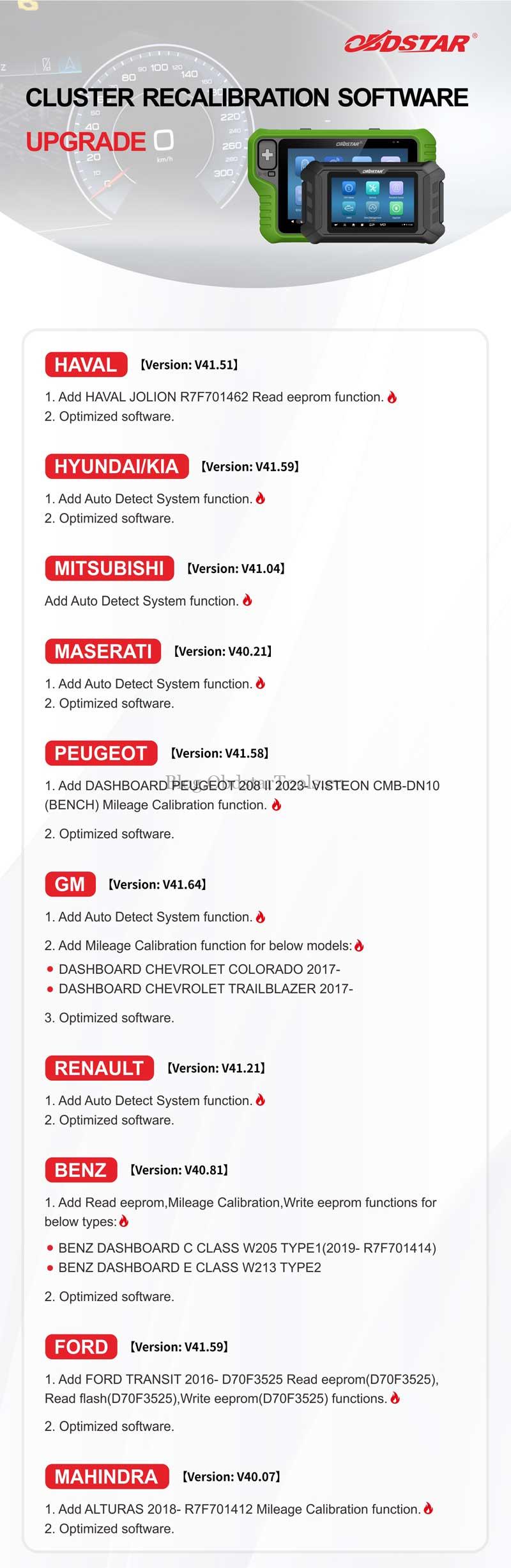 OBDSTAR has released a major software update for its professional cluster recalibration tools, introducing critical support for Haval Jolion, Benz W205/W213, Peugeot 208 II, Ford Transit, and GM models like the Chevrolet Colorado. This update enhances the capabilities of popular hardware including the X300 Classic G3, OdoMaster, and the X300 Mini series.